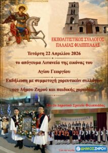Ο Δήμος Ζηρού και ο Εκπολιτιστικός Σύλλογος Παλαιάς Φιλιππιάδας σας προσκαλούν σε δύο ξεχωριστές εκδηλώσεις με αφορμή τη γιορτή του Αγίου Γεωργίου, γεμάτες παράδοση, πίστη και πολιτισμό.