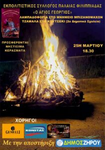 Η παράδοση και το πνεύμα της κοινότητας ζωντανεύουν και φέτος μέσα από μια ξεχωριστή εκδήλωση που διοργανώνει ο Εκπολιτιστικός Σύλλογος Παλαιάς Φιλιππιάδας «Ο Άγιος Γεώργιος». Με αφορμή τον εορτασμό της 25ης Μαρτίου, σας προσκαλούμε τόσο σε μια μοναδική Λαμπαδοφορία στο Μνημείο Μπιζανομάχων όσο και σε μια Τζαμάλα, στο Κουτσεκί (2ο Δημοτικό Σχολείο), την Τρίτη 25 Μαρτίου στις 18:30.