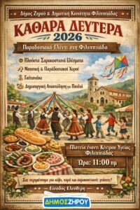Ο Δήμος Ζηρού και η Δημοτική Κοινότητα Φιλιππιάδας σας προσκαλούν να γιορτάσουμε μαζί την Καθαρά Δευτέρα 2026 σε ένα αυθεντικό παραδοσιακό γλέντι γεμάτο μουσική, χορό και σαρακοστιανές γεύσεις!