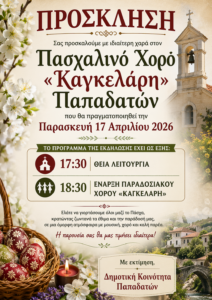 15 Απριλίου, 2026 Ανακοινώσεις Πρόσκληση στον Πασχαλινό Χορό “Καγκελάρη” Παπαδατών Προηγούμενο Πρόσκληση στην Ιερά Πανήγυρη Ζωοδόχου Πηγής – Τύργιας Επόμενο Πρoσκλήσεις για τον εορτασμό του Αγίου Γεωργίου στην Παλαιά Φιλιππιάδα